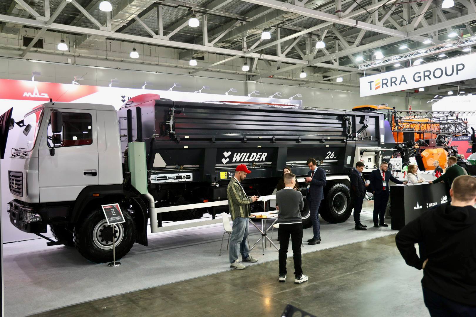 На стенде был представлен картофелевоз на базе полноприводного шасси МАЗ-630226, который разработан специально для перевозки картофеля, свёклы, моркови и других корнеплодов. Новая машина сочетает мощность классического грузовика МАЗ и инженерные решения кузовостроителей WILDER, обеспечивая точную, бережную и быструю выгрузку продукции.