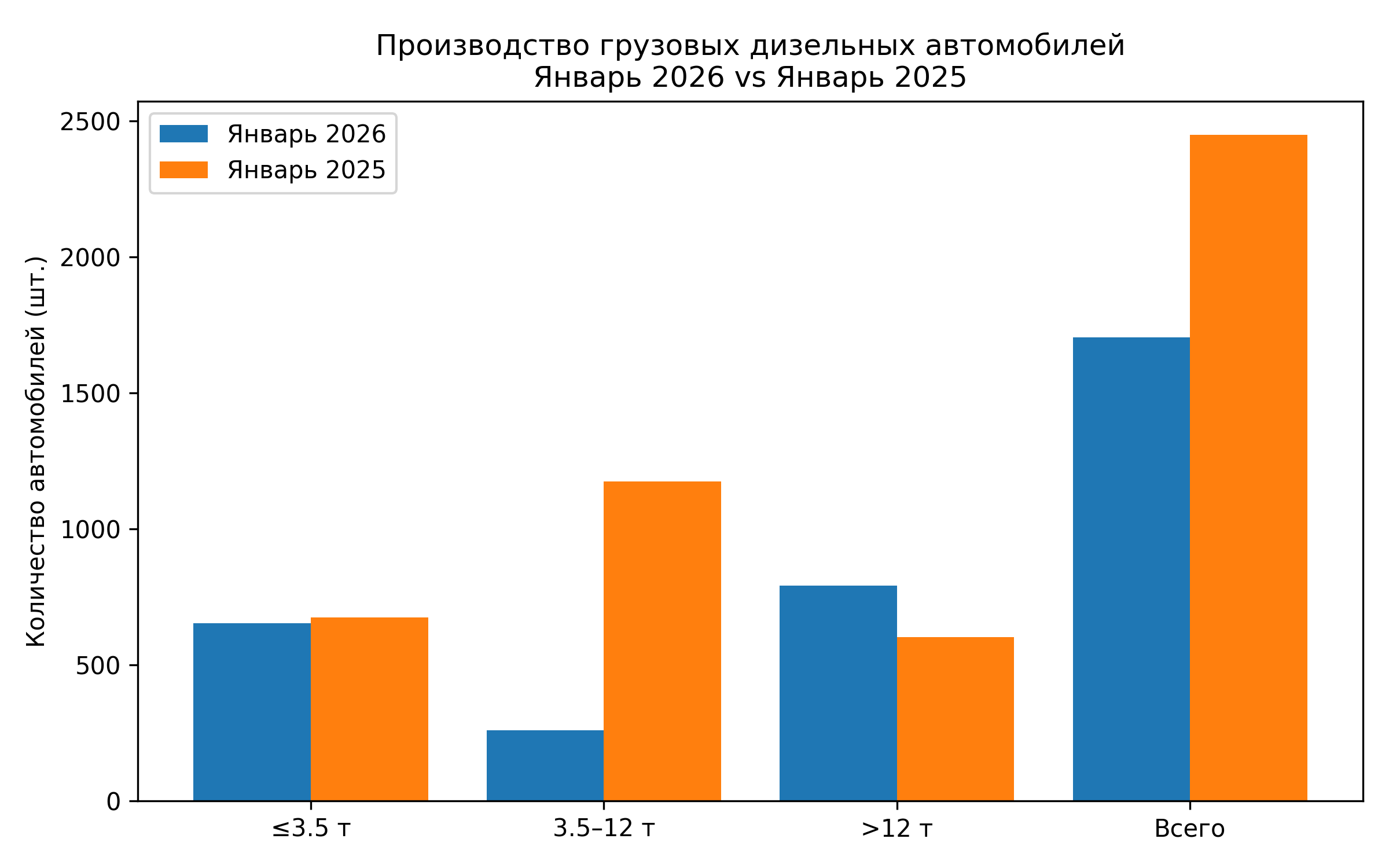 Наиболее заметные изменения зафиксированы в категории грузовых автомобилей массой от 3,5 до 12 тонн. В январе 2026 года производство в этом сегменте составило 260 машин, тогда как в январе 2025 года выпуск достигал 1 173 единиц. Такие автомобили активно применяются в региональных перевозках, строительстве и коммунальной сфере, поэтому их выпуск во многом зависит от деловой активности и реализации инфраструктурных проектов.