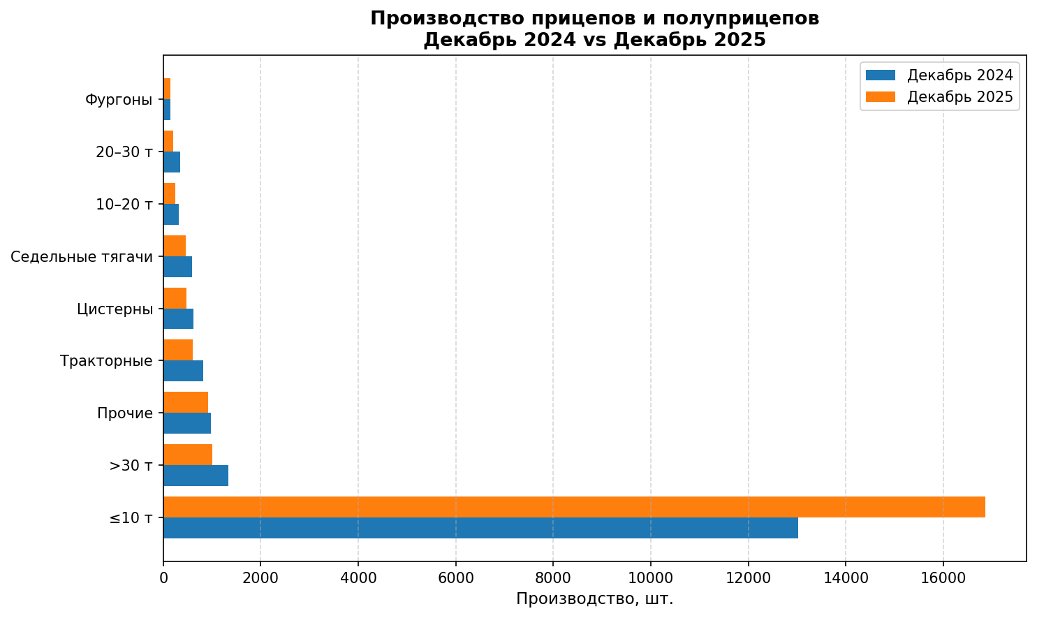 Наибольший объём в декабре 2025 года обеспечил сегмент прицепов и полуприцепов массой до 10 тонн — 16 859 единиц против 13 014 годом ранее. Несмотря на рост по месяцу в этой категории, годовая динамика остаётся отрицательной.