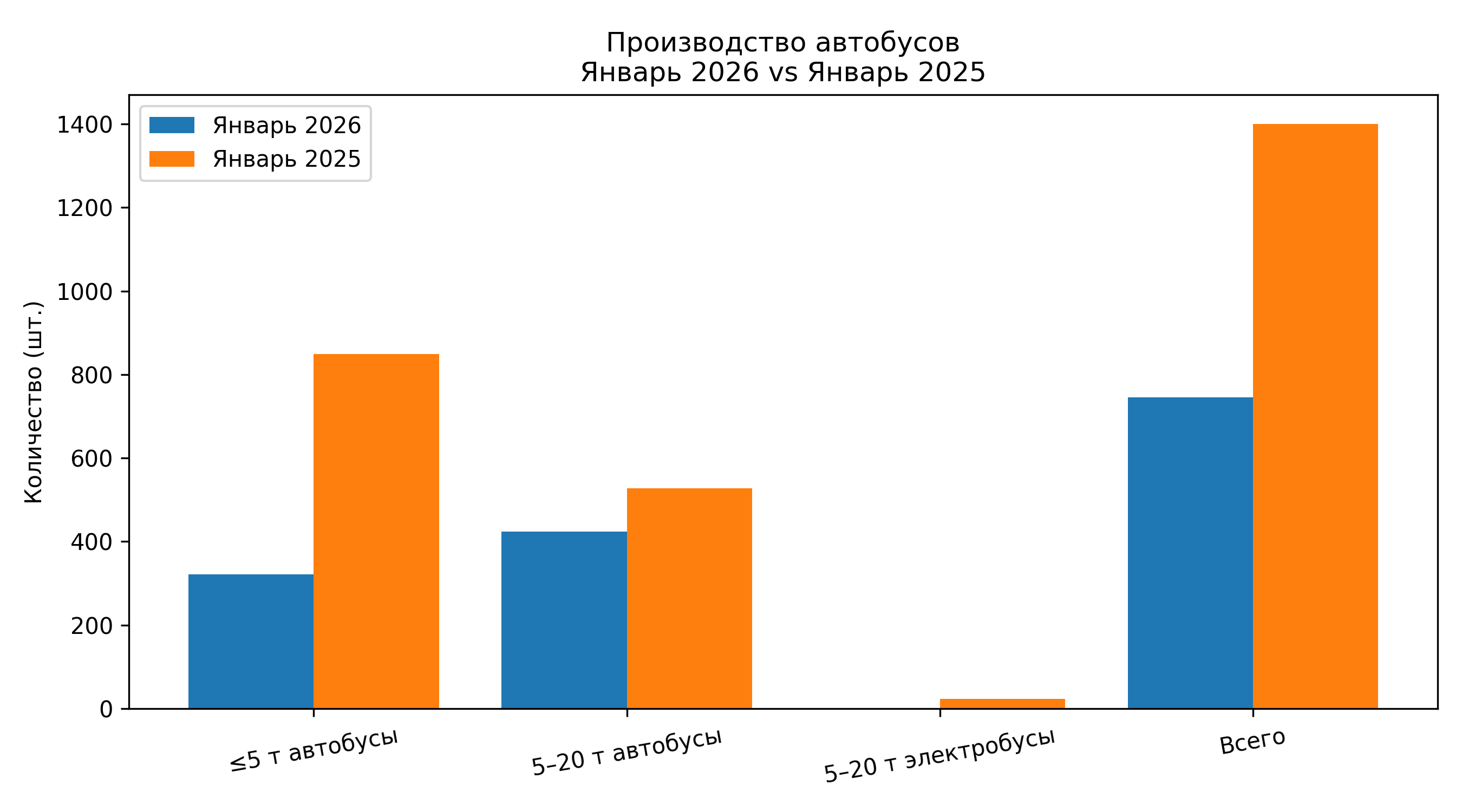 Наиболее заметные изменения отмечены в сегменте автобусов массой до 5 тонн. В январе 2026 года произведено 321 транспортное средство, тогда как годом ранее — 849 единиц. Разница в этой категории превышает двукратный уровень. Учитывая вес данного сегмента в структуре выпуска, именно он обеспечил основной вклад в изменение общего результата.